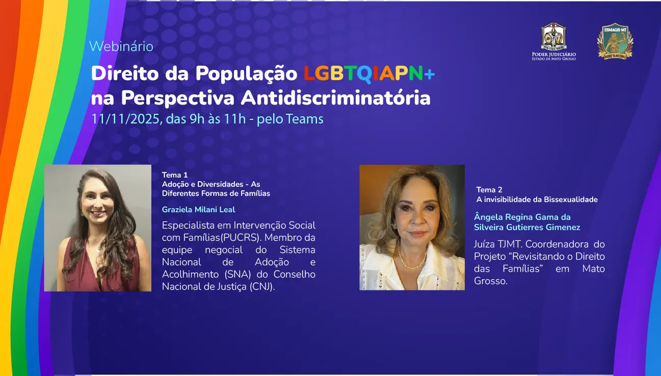 A Escola Superior da Magistratura de Mato Grosso (Esmagis-MT) e a Comissão Estadual Judiciária de Adoção (Ceja), ligada à Corregedoria-Geral da Justiça (CGJ-MT), realizam, no dia 11 de novembro, das 9h às 11h, o webinário “Direito da População LGBTQIAPN+ na Perspectiva Antidiscriminatória”. A atividade pedagógica será ofertada de maneira on-line, via plataforma Microsoft Teams.