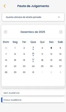 • Calendário mensal integrado, que destaca visualmente os dias com e sem audiência, facilitando o planejamento jurídico.